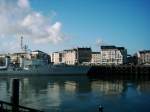 Strassenbahn Bombardier Incentro fährt im französischen Nantes an der Loire, wo ein Kriegsschiff abgestellt ist. Linie A. Aussicht vom  Ile de Nantes  (Insel von Nantes in der Loire).