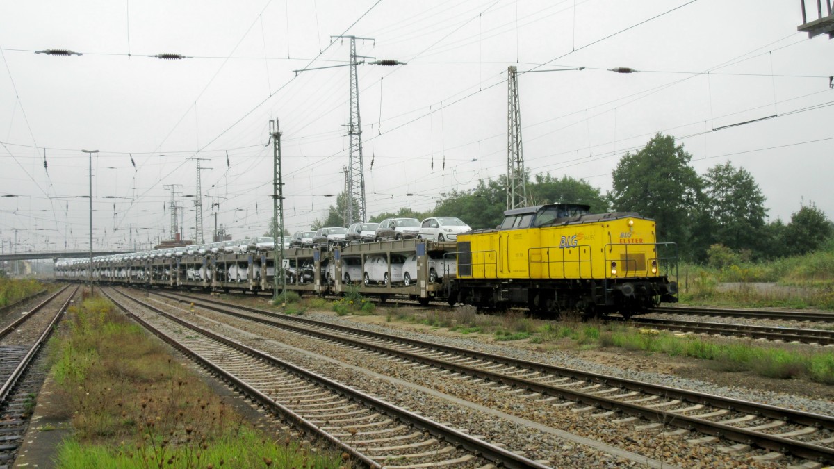 am 12.9.14 kam die BLG "Falke" 203 136-7 mit leeren Autowaggons durch Falkenberg (E.) oben am Gleis 7 durchgefahren Richtung BLG Stützpunkt Silvio Hass