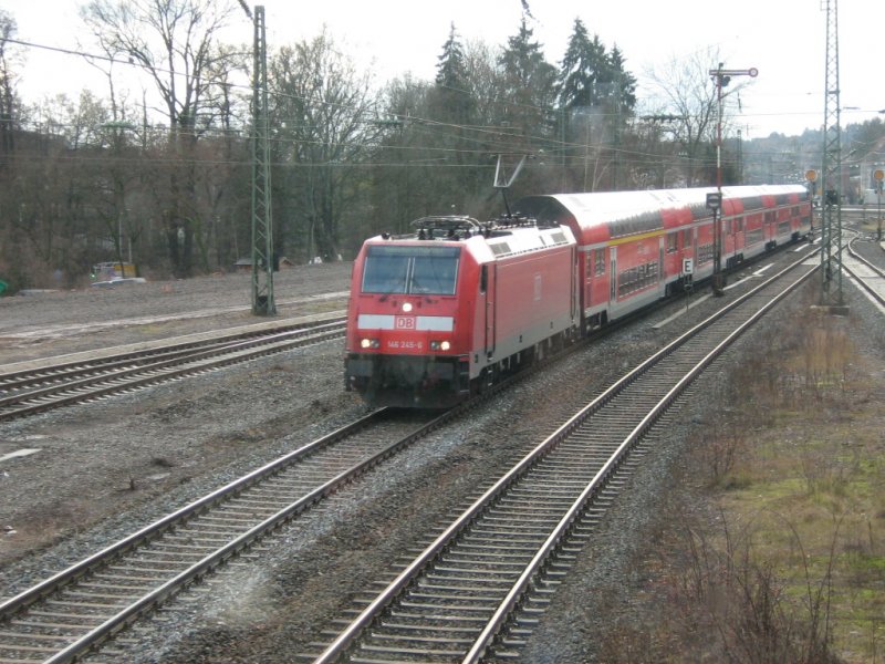 Einfahrt des RE 4974 von Nürnberg Hbf nach Sonneberg(Thür) am 04.12.2007 ca. 11.28 Uhr in Coburg Pbf. Triebfahrzeug 146 mit Dosto-Einheit.