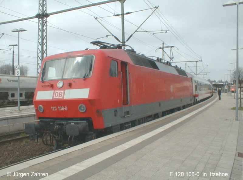 E 120 106-0 hat sich in Itzehoe vor den IC aus Westerland gesetzt (April 2004)