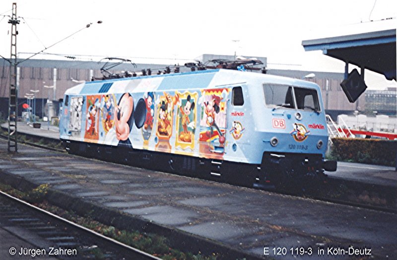 E 120 119-3 "70 Jahre Micky Maus" im Nov. 1998 in Köln-Deutz. Gleiche Lok, anderes Gleis.