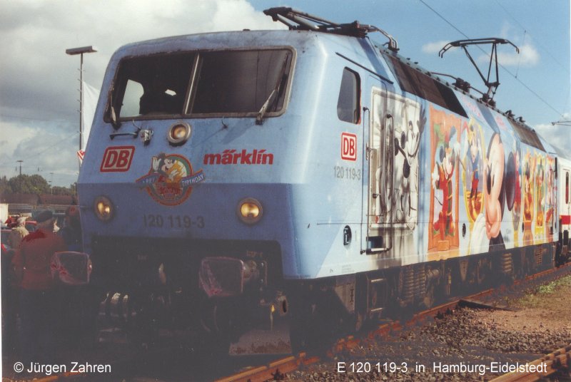 E 120 119-3  70 Jahre Micky Maus  steht in Köln-Deutz im Nov. 1998. Sie wurde extra für die Besucher der Modellbahn-Messe dorthin gestellt!