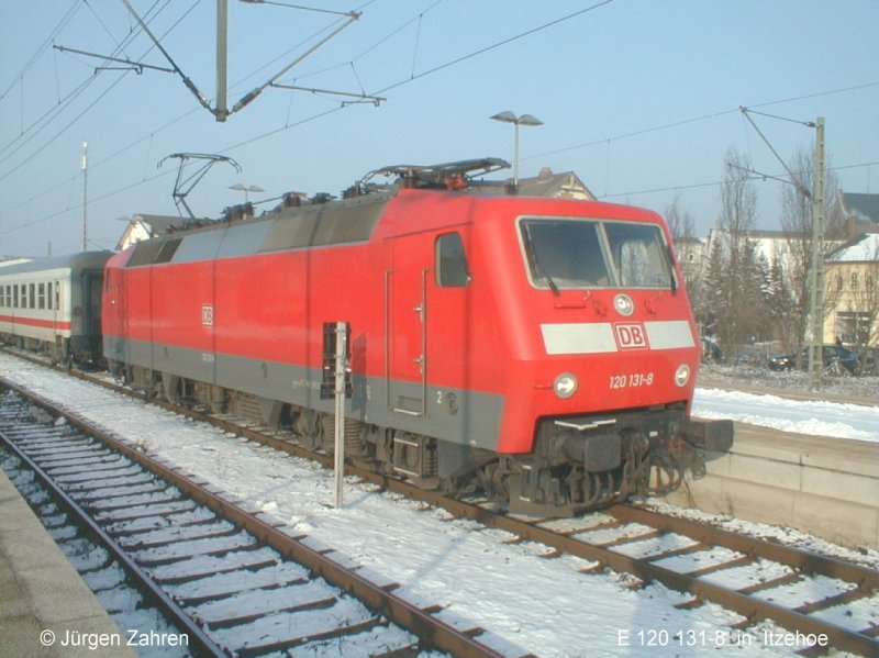 E 120 131-8 setzt sich vor den IC in Itzehoe, der gerade von zwei 218 aus Westerland gebracht wurde.(Jan. 2004)