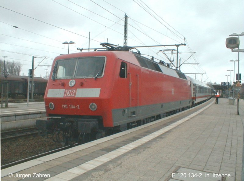 E 120 134-2 steht abfahrbereit mit ihrem IC am Gleis 3 in Itzehoe.(Febr. 2004)