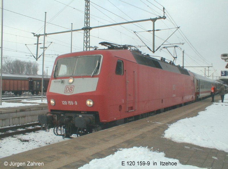 E 120 159-9 steht abfahrbereit im Bahnhof Itzehoe (Jan. 2004)