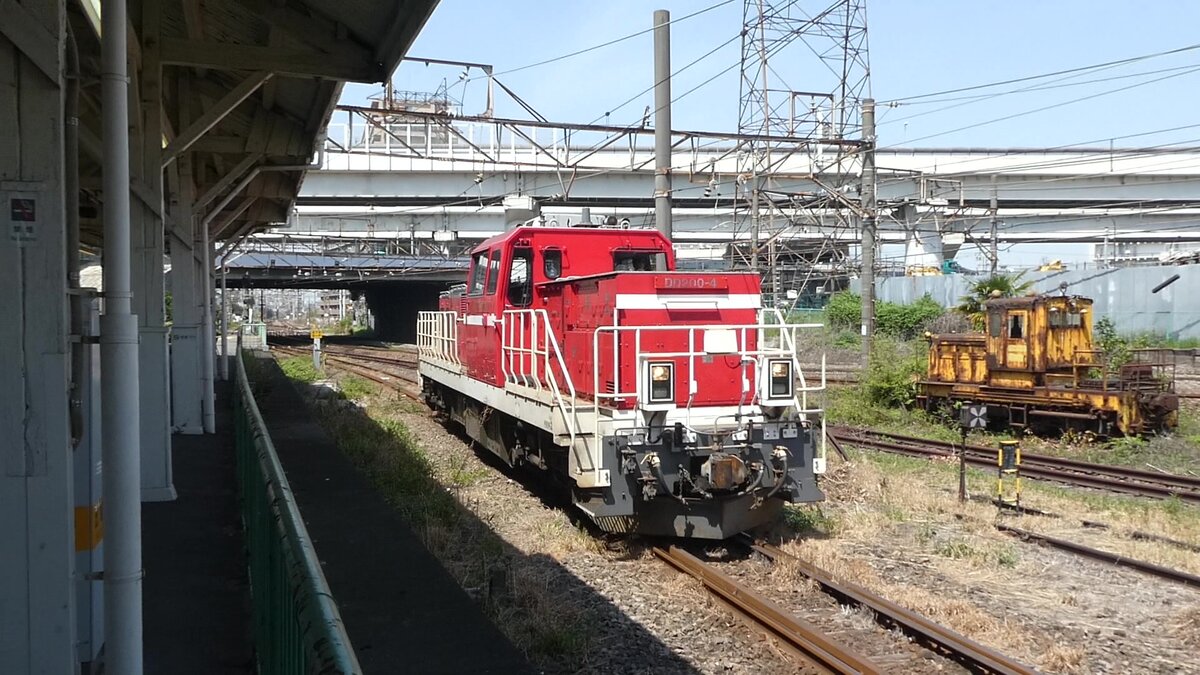 Die Diesellok DD200-4 am bahnhof Hama-Kawasaki, 15.04.2024. Die Gelb kleinlok rechts ist das Modell TMC200A von Fuji Heavy Industries aus dem Jahr 1966.
