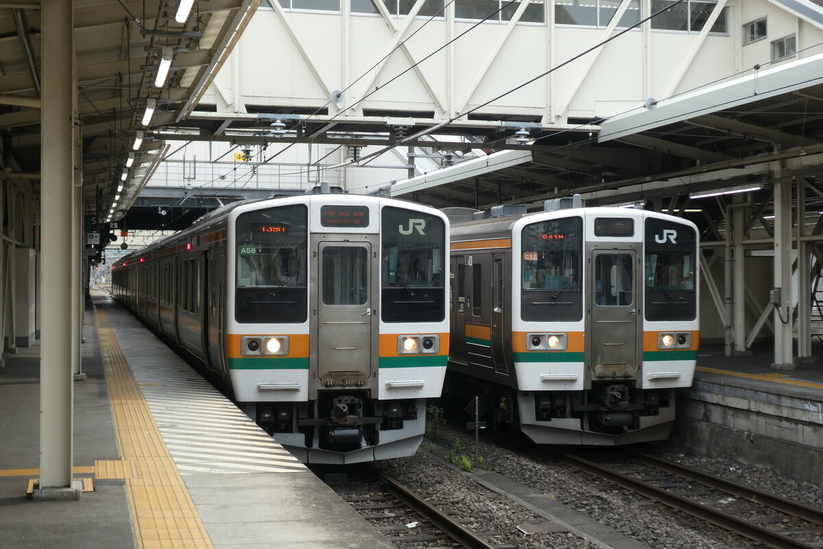 Die zwei elektrotriebzüge serie 211 (Untergruppe 3000) warten auf die Abfahrt: Fahrtnummer 139M Shin'etsu linie Nahverkehrszug nach Yokokawa, und 641M Ryômô linie nahverkehrszug nach Isesaki. am bahnhof Takasaki, 29.04.2024.