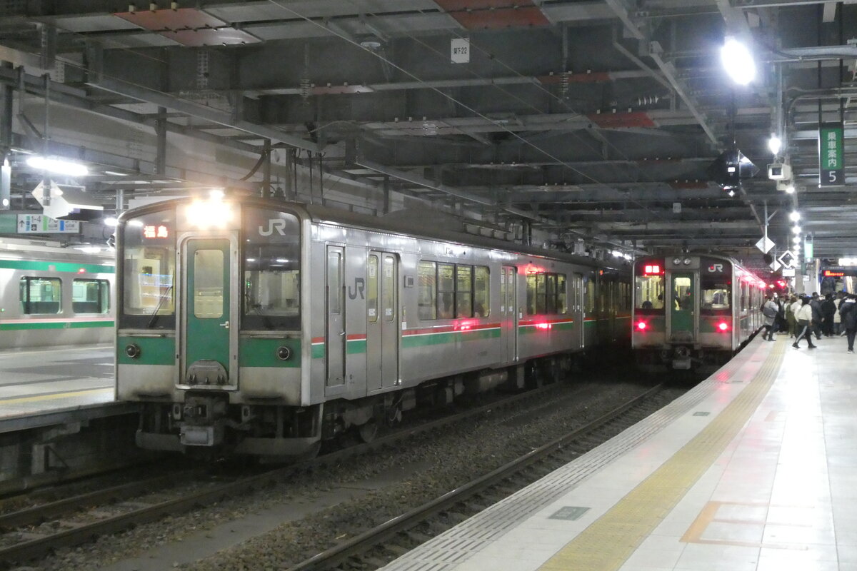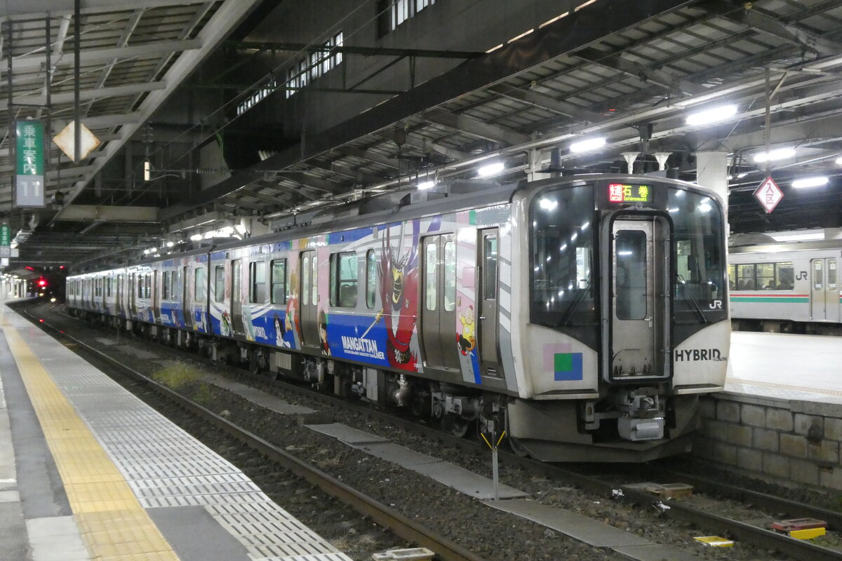 JR East Senseki- / Tôhoku Linie Nahverkehrszug mit Hybridtriebzug serie HB-E210, am Bahnhof Sendai. 06.01.2024