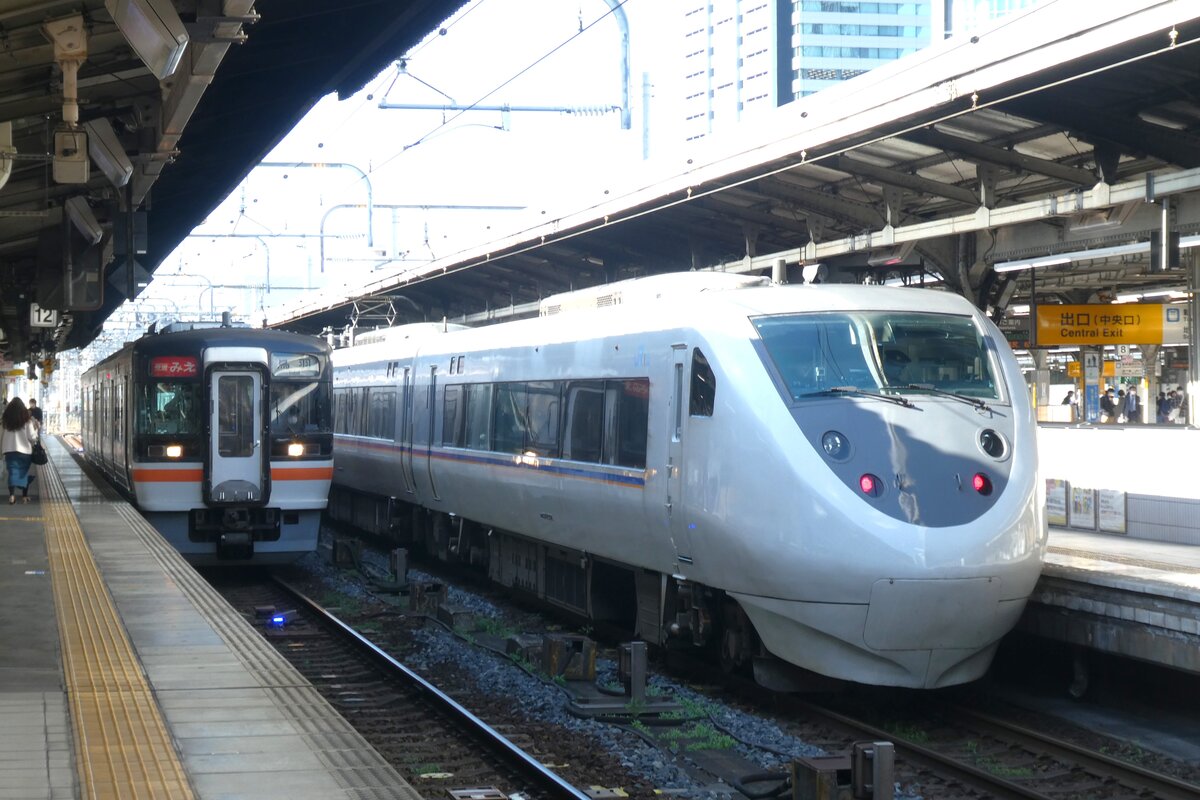 JR Rapid service  Mie  von Nagoya nach Toba mit Dieseltriebwagen serie KiHa-75 (links), und Limited Express service  Shirasagi  von Nagoya nach Tsuruga mit Mehrsystem Elektrotriebzug (AC 60Hz/DC) serie 681 (rechts). am bahnhof Nagoya, 29.03.2024.