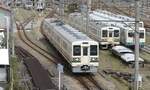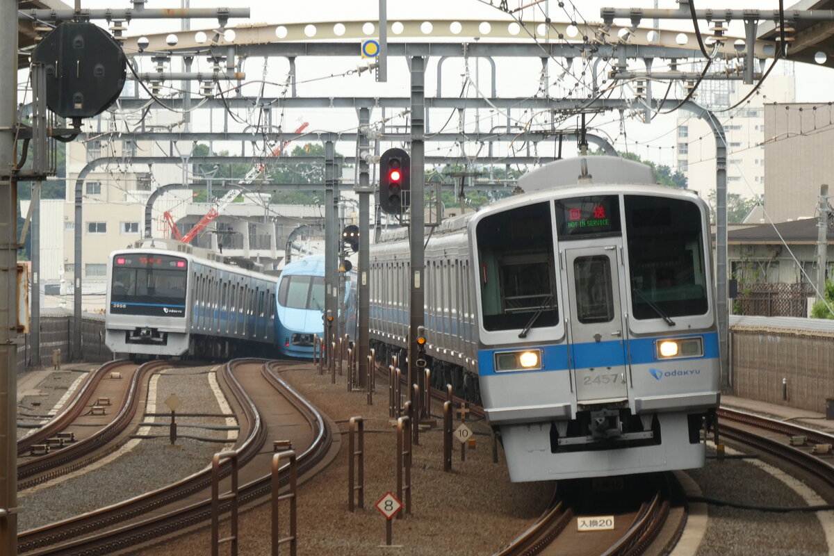 Odakyû Konzern serie 2000  Not in Service  fährt am Bahnhof Gôtokuji vorbei. Die Züge auf der linken Seite sind die Serien 3000 und 60000. 19.05.2024