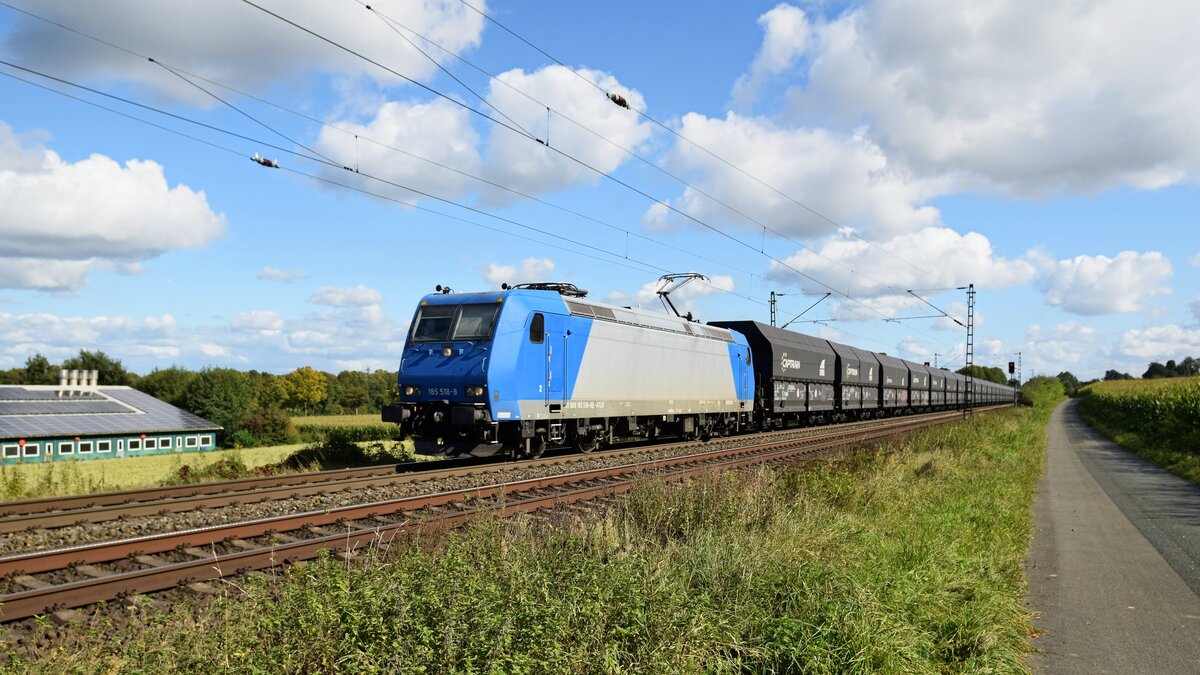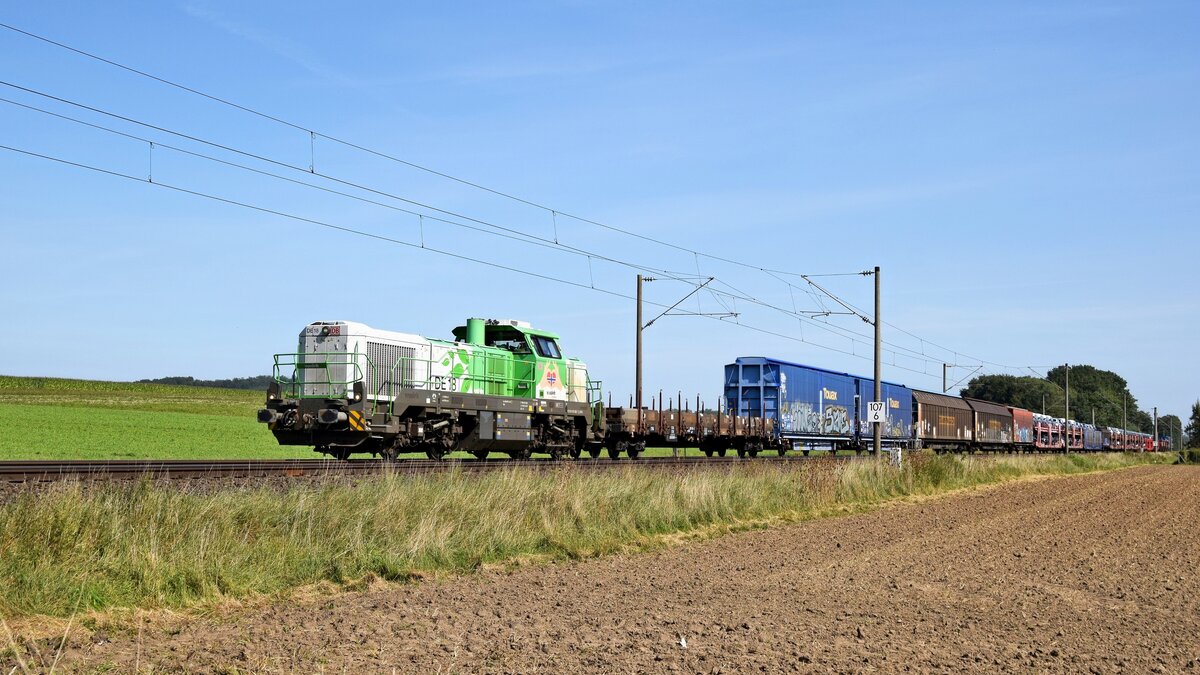 ENON (ex DB Cargo) 185 303-5 (91 80 6185 303-5 D-EGP), vermietet an EGP, mit LKW-Walter-KLV-Zug in Richtung Osnabrück (Bohmte-Stirpe, 01.10.2025). Reinhard Kühn