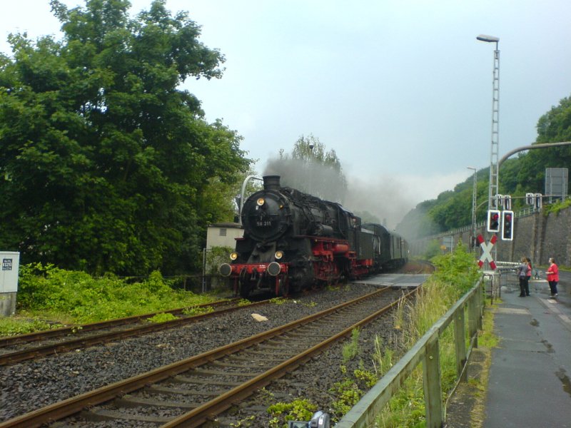 58 311 der Ulmer Eisenbahnfreunde zieht ihren Sonderzug von Bad Kreuznach nach Bingen Hbf.Das Bild entstand am BÜ kurz vor Bingen Hbf (Schublok war 50 2740).08.06.08