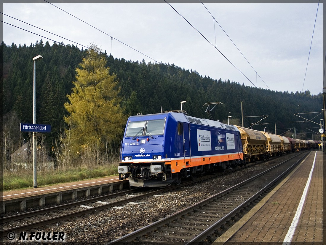 Raildox 185 409 befördert einen Ganzzug mit Wagen des Stickstoffwerks Piesteritz über den Frankenwald Richtung Süden am 11.11.2014 in Förtschendorf Norbert Föller
