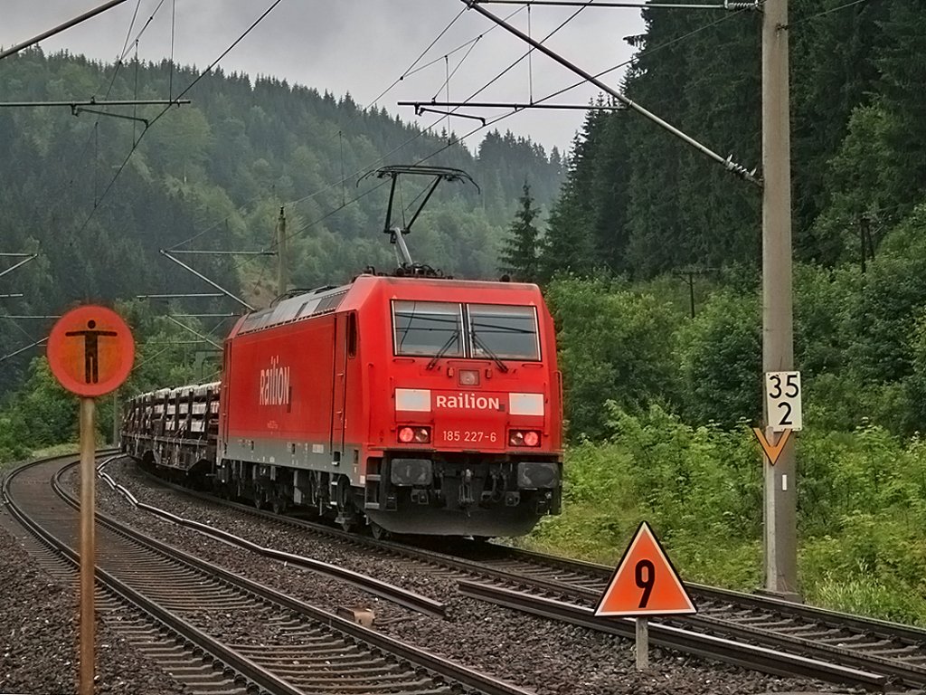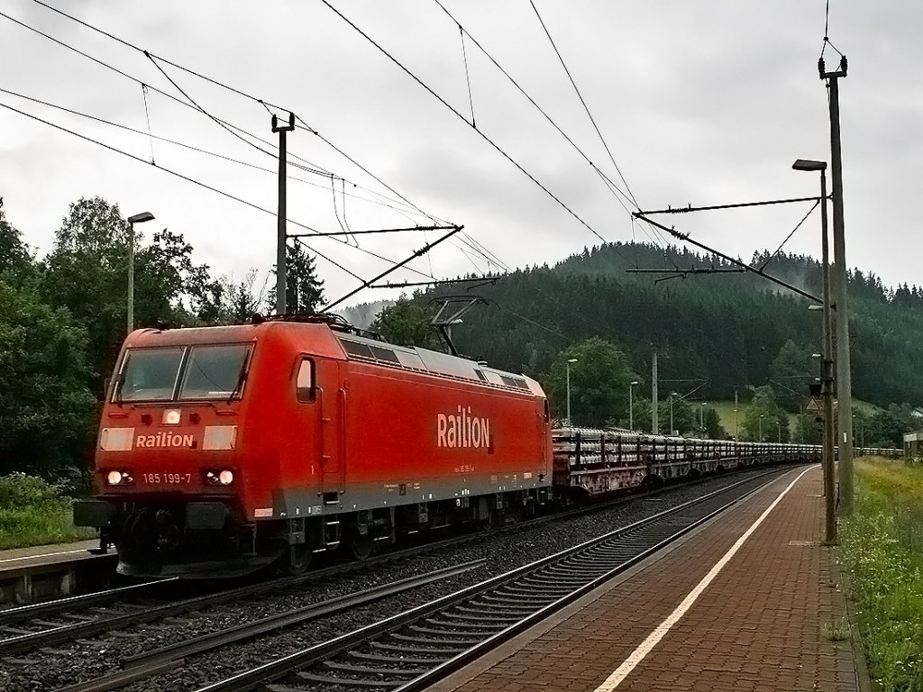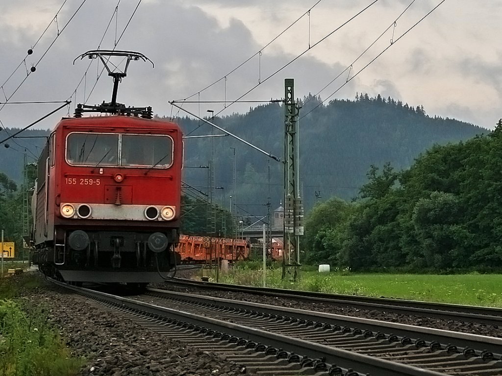 155 259 mit einem gemischten Güterzug unterwegs zwischen Pressig und Rothenkirchen Richtung Norden vom Radweg an der B 85 aus am 01.07.2012