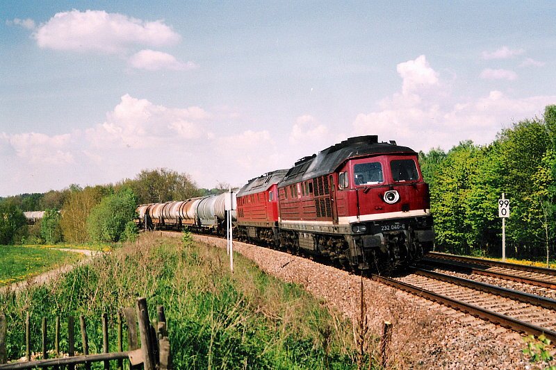 Kurz vor dem Hp Limbach im Vogtland sind 232 040 + 232 535 mit einem schweren Kesselzug in Richtung Hof unterwegs, 11. Mai 2001.