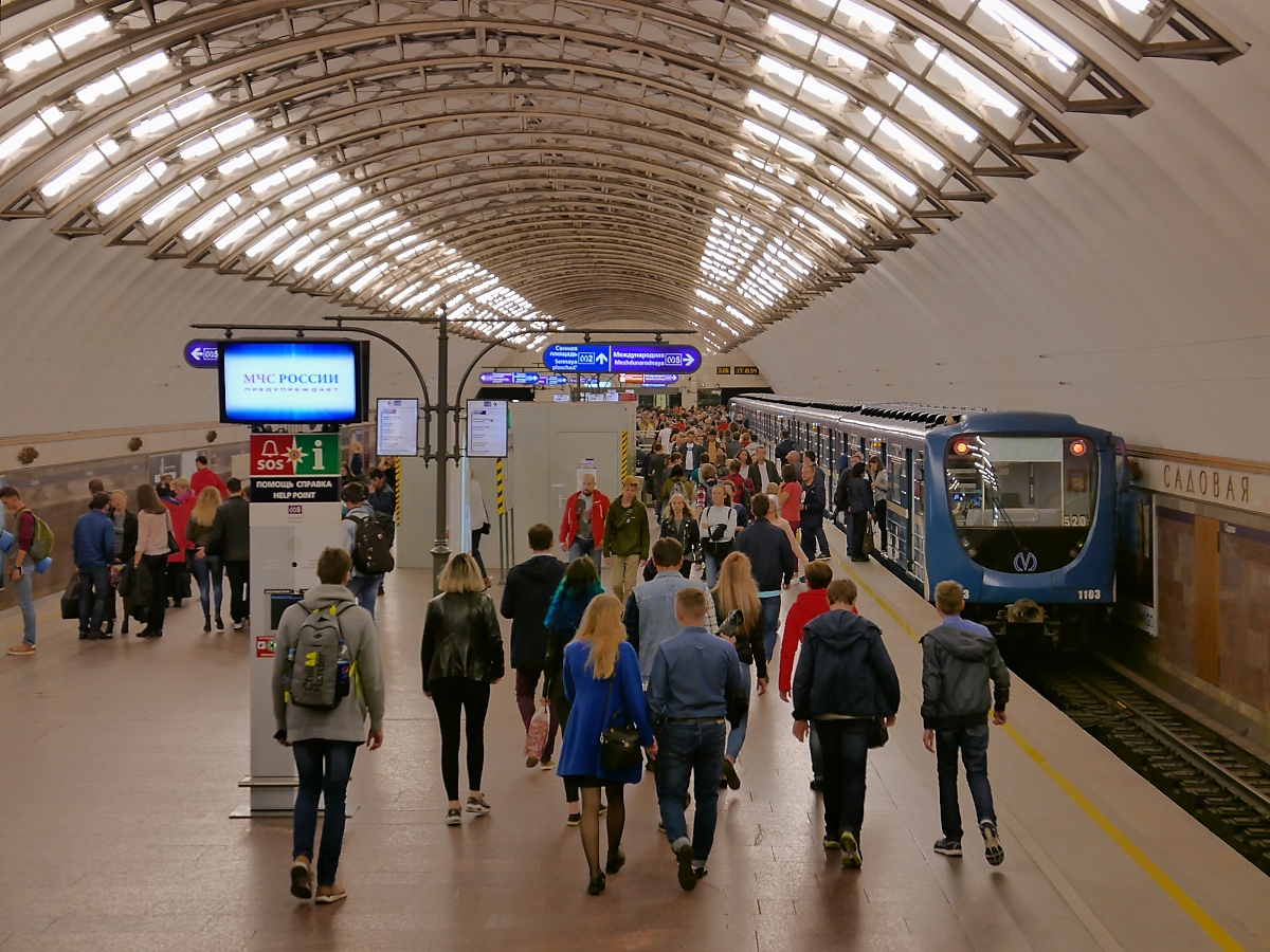 Reges Treiben in der Metro-Station Sadovar, die mit einer interessanten Deckenbeleuchtung beeindruckt. St. Petersburg, 10.9.2017