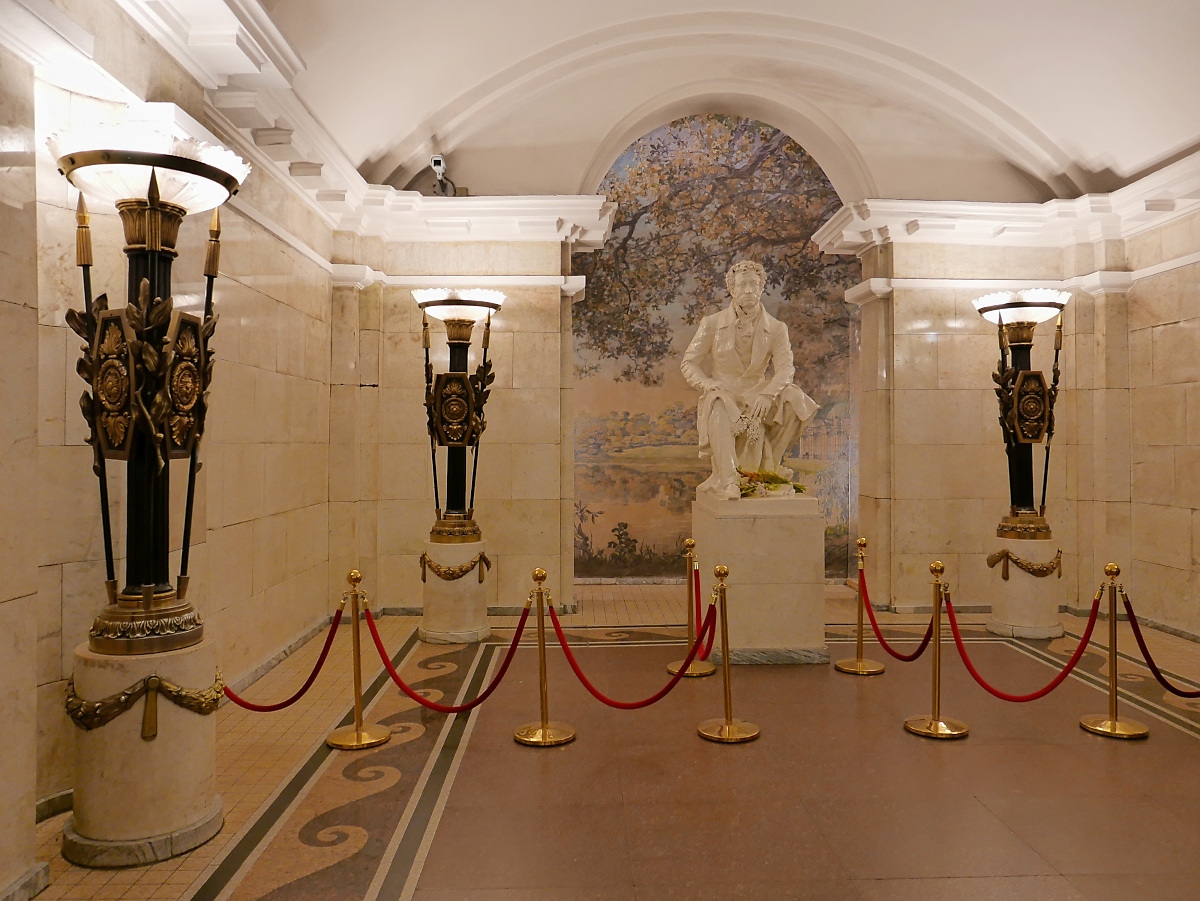 Am Ende der Station "Puschkinskaja" der Metro der Linie 1 in St. Petersburg sitzt der berühmte Dichter Alexander Sergejewitsch Puschkin, 16.09.2017 Patrick Sesseler