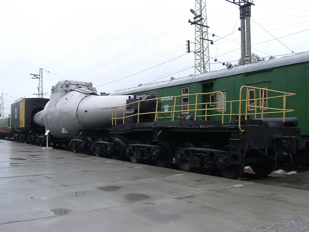 Ein 16-achsiger Wagen mit einem Leergewicht von 208,5t zum Transport von 150t flüssigem Gusseisen am 23.8.2001 im Museum für Eisenbahntechnik Nowosibirsk. Heinz Bergner
