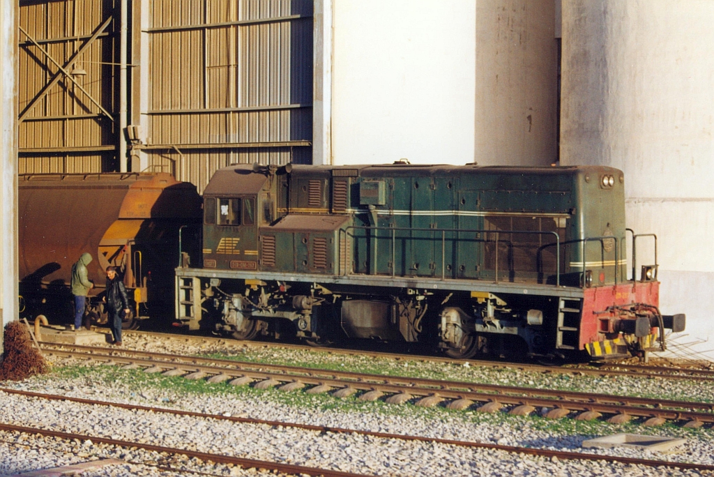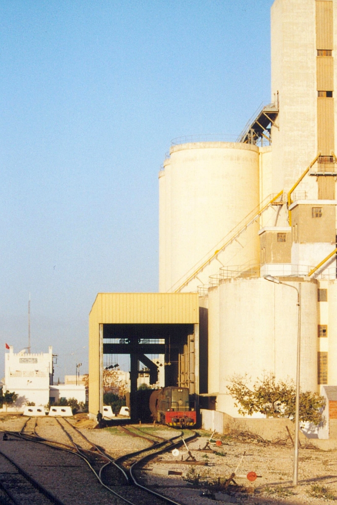 Winzig im Verhältnis zu den mächtigen Silos erscheint die 040-DM-257 (Hersteller: GE, Type: 10UB, Fab.Nr.: 43930, Baujahr 1982) am 27.Dezember 2001 beim Verschub im Gare de Kalaa Sghira. (Fotoscan) Karl Seltenhammer