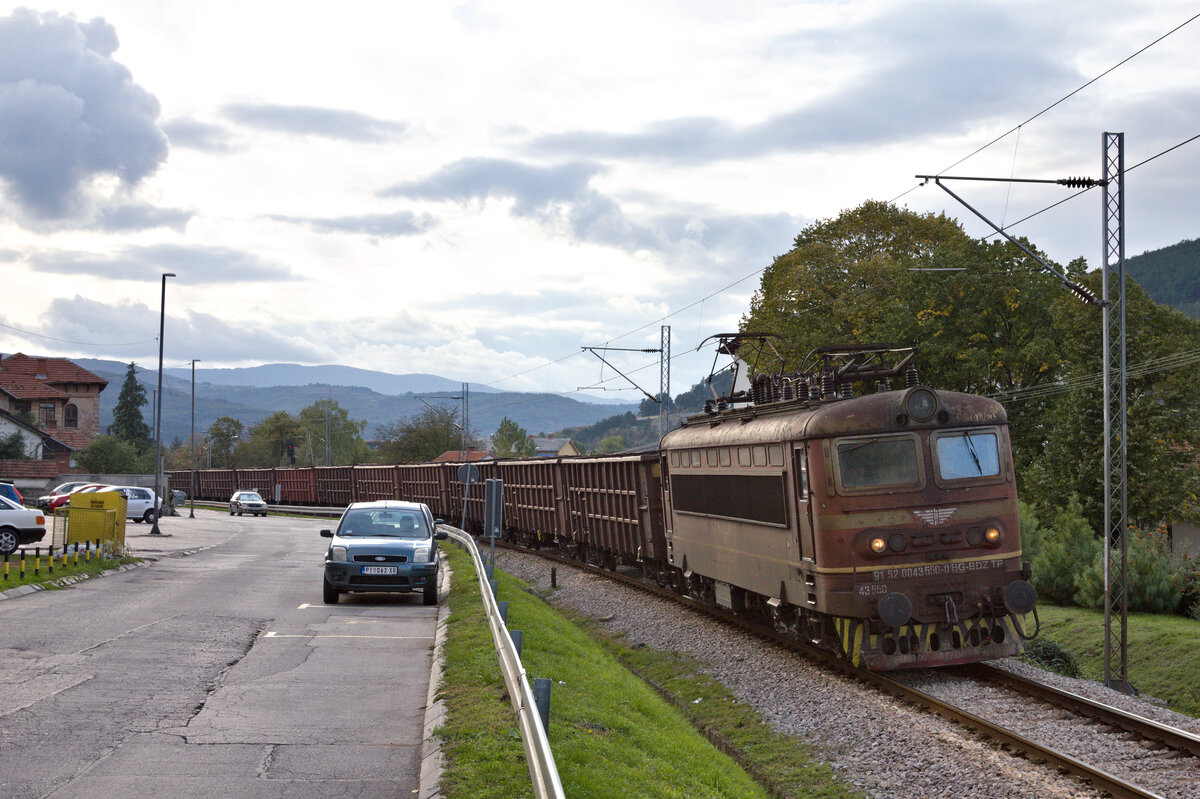 Lang angekündigt durch das Bimmeln des Bahnübergangs kommt ein E-Wagen-Ganzzug gezogen von der bulgarischen 43 550 um die Ecke. Dimitrovgrad am 04.10.2022.