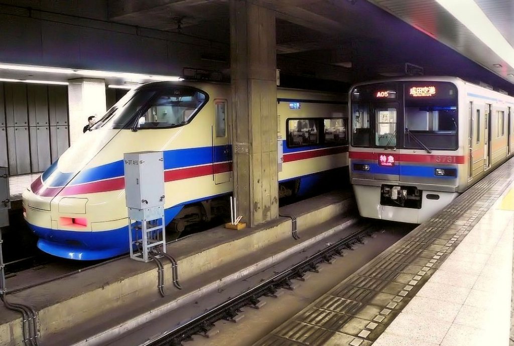 Grunddaten des Keisei-Konzerns: "Keisei" heisst "Verbindung von Tokyo zur Stadt Narita". Der Konzern betreibt verschiedene Verkehrssysteme und Taxis, Warenhäuser, Grundstückverkauf, und ein eigenes Bahnnetz (1435mm-Spur, 1500 V Gleichstrom). Bekannt für viele kleinere S-Bahnstrecken sowie seine preisgünstige Verbindung von Tokyo zum Internationalen Flughafen Tokyo in Narita. Flughafenzüge und viel neue Infrastruktur schon 1973 bereit, wegen schweren Krawallen im Zusammenhang mit dem Flughafenbau konnte erst 1978 ein abseits gelegener Bahnhof "Narita Ost" erreicht werden; der Flughafenbahnhof selbst wurde erst 1991 eröffnet. Der Konzern stand in den 1970er/80er-Jahren am Rand des Ruins. Bild: Ausgangsbahnhof Tokyo-Ueno, links ein Flughafenexpress, rechts ein S-Bahnzug, 4.März 2010. Peter Ackermann