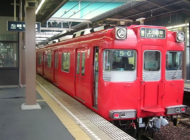Meitetsu-Konzern, U-Bahn-taugliche Züge Serie 100: Die Tsurumai-Linie der U-Bahn Nagoya ist am östlichen Ende mit der Meitetsu-Linie nach Toyota (wo die gleichnamigen Autos herkommen) verknüpft. U-Bahn-Wagen fahren nach Toyota, umgekehrt kommen Meitetsu-Wagen auf die U-Bahn. Meitetsu Serie 100 besteht aus 11 6-Wagenzügen, gebaut 1978-1993. Bild: Wagen 212 (1991) in Kami Otai, 25.März 2007.