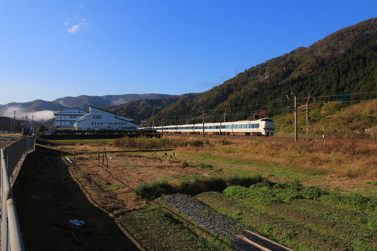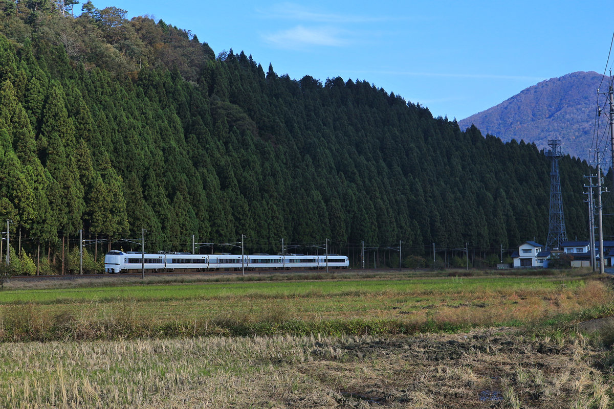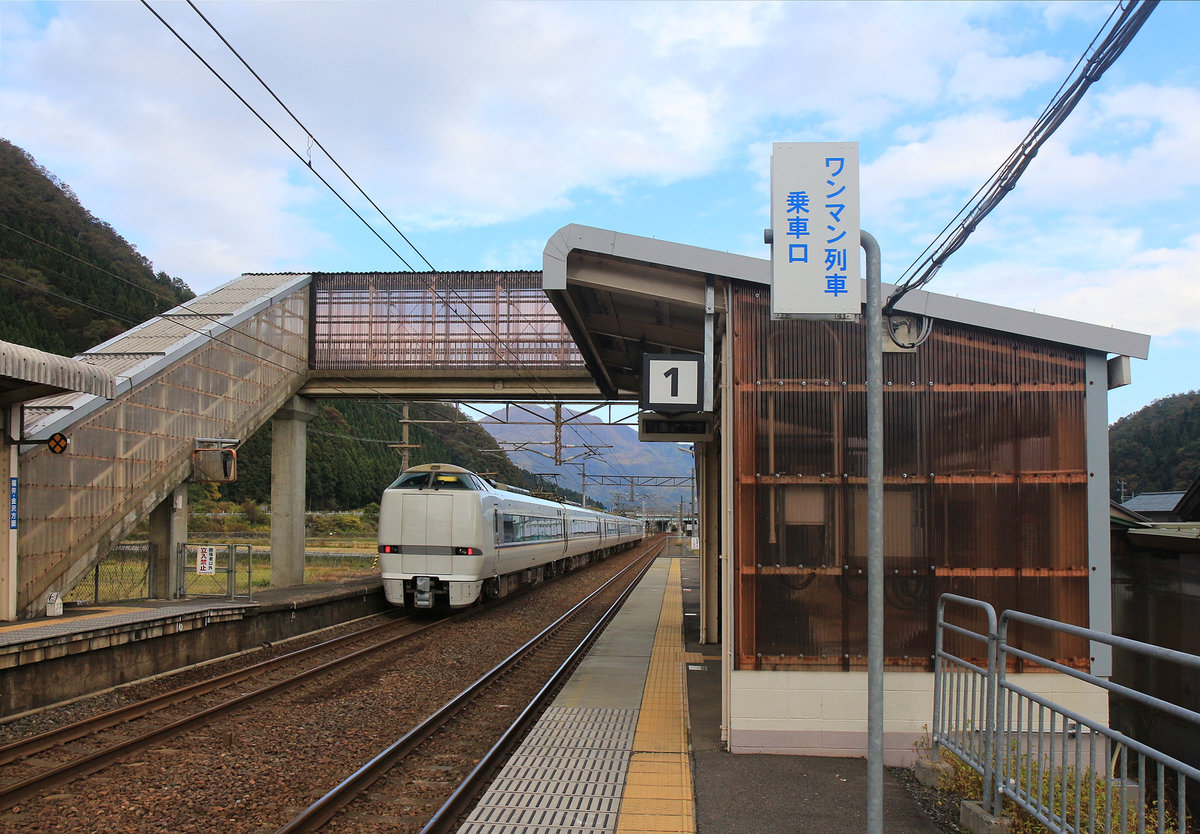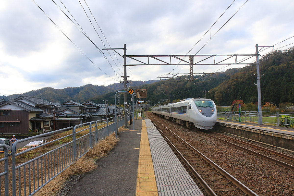 Die Intercity-Züge nach Kanazawa, dem Japanischen Meer entlang: Ein Zweistromzug Serie 681 in einem Dienst Kanazawa - Maibara (mit Anschluss nach Nagoya). Yuno-o, 5.November 2018 Peter Ackermann