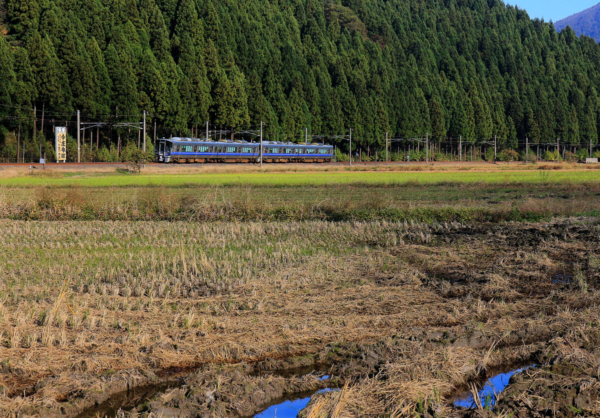 Die zweiteiligen Zweistrom-Regionaltriebwagen am Japanischen Meer: Ein Triebzug der Serie 521 in den Bergen bei Yuno-o, 5.November 2018 Peter Ackermann