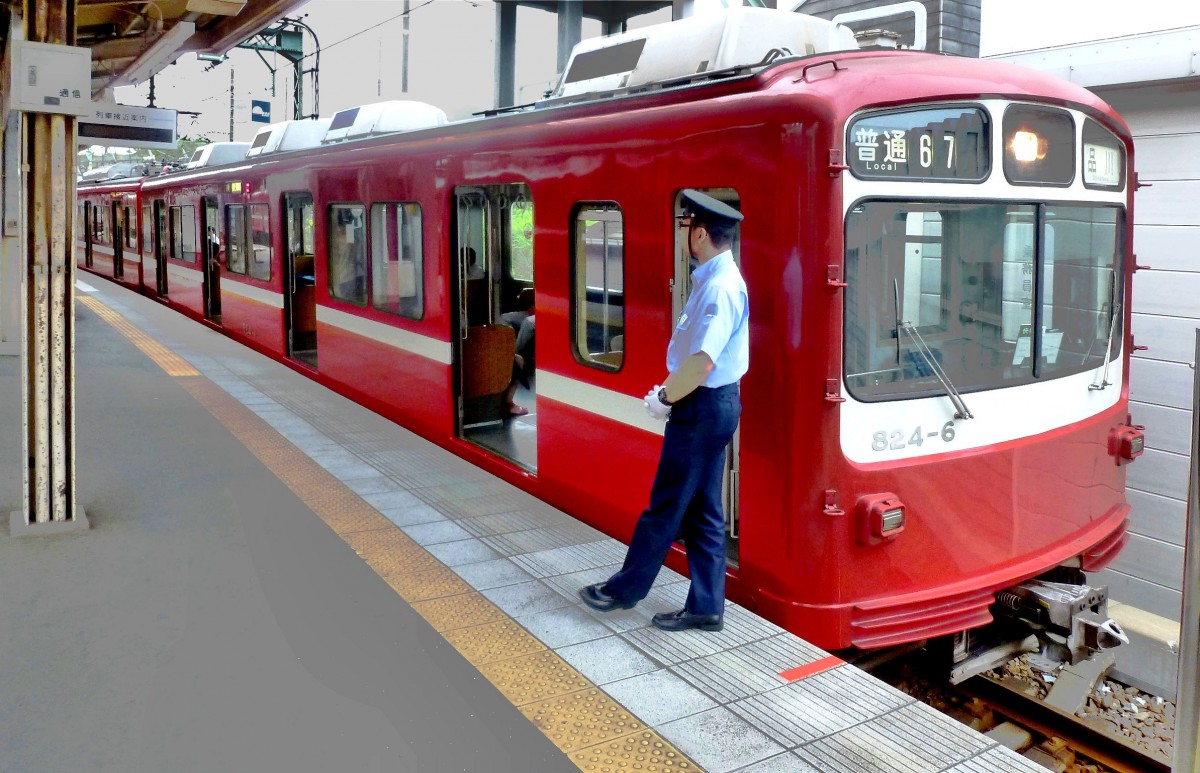 Der Keikyû-Konzern: Zug 824 in einem Lokaldienst wartet in Koyasu das Vorbeibrausen von Schnellzügen ab, bevor er sich wieder gemächlich auf den Weg nach Tokyo begeben kann. Zeit auch für einen kleinen Schwatz mit dem Wagenführer. 25.Juni 2011. Peter Ackermann