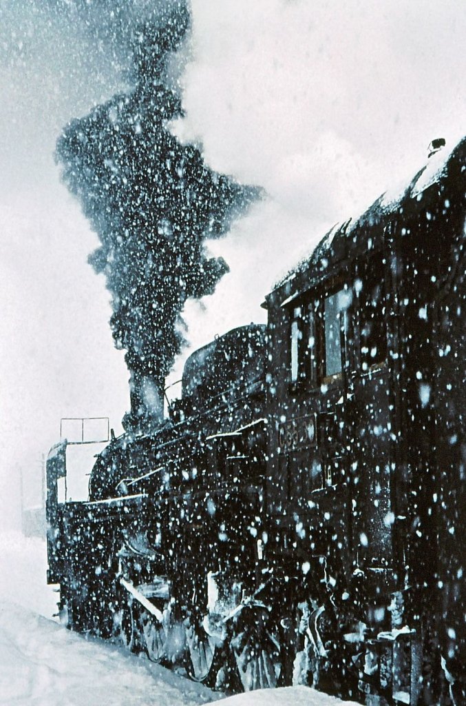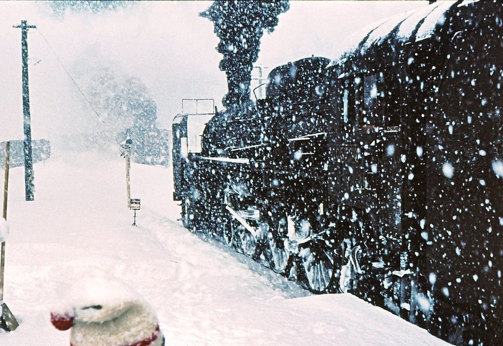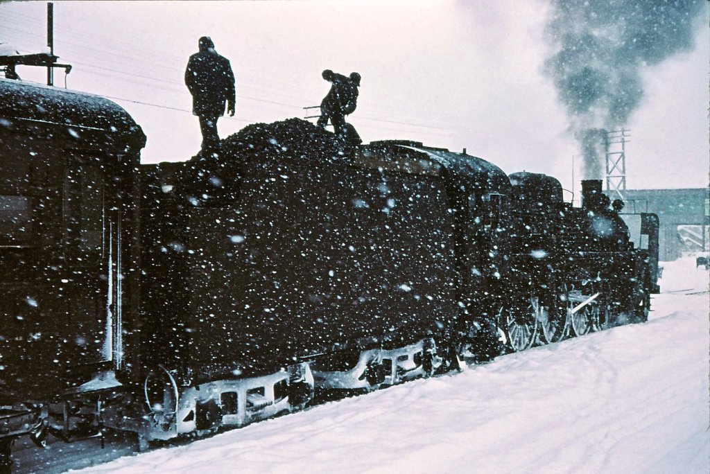 C55 30: Diese Lok war einst eine Stromlinienlok, erkennbar am stark abgerundeten Führerhausdach. Im Bild wartet sie auf Abfahrt im alleräussersten Norden Japans, Horonobe, 27.Dezember 1971. Peter Ackermann