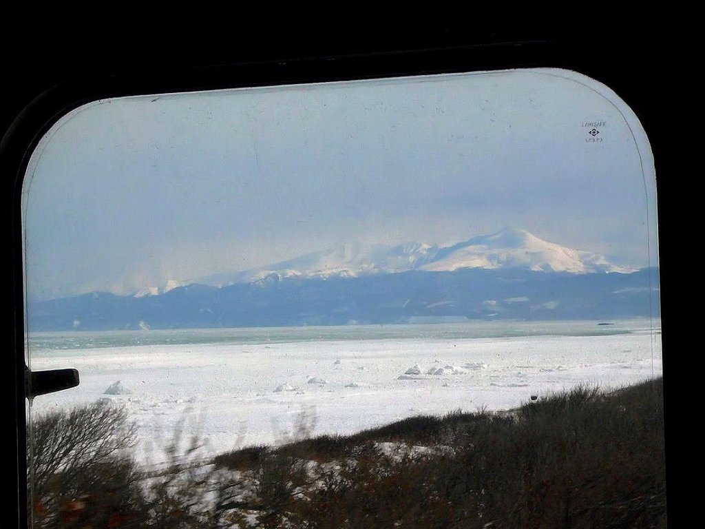 Lokalverkehr in Ost-Hokkaido: Im mittleren Frontfenster des KIHA 54 514 (öffentlich zugänglich) kommt die Rausu-Vulkankette hinter dem Ochotskischen Meer in Sicht. Bei Yamubetsu, 18.Februar 2009. SEMMÔ-LINIE Peter Ackermann