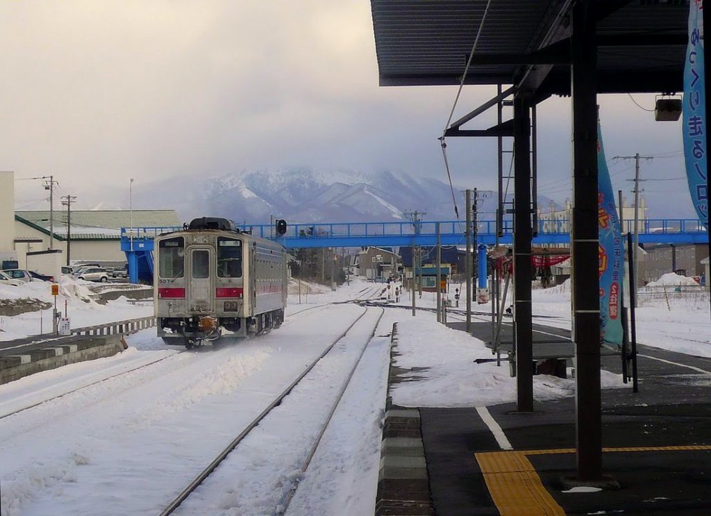Lokalverkehr in Ost-Hokkaido: KIHA 54 507 fährt aus der Station Shiretoko Shari aus; im Hintergrund die Vulkankette der Shiretoko Halbinsel. Die Serie KIHA 54 wurde 1986 gebaut; 501-529 für Hokkaido (und 12 weitere für die Insel Shikoku). Bemerkenswert ist ihre spezielle Pfeife zum Verscheuchen der grossen Hirsche. 17.Februar 2009. SEMMÔ-LINIE Peter Ackermann