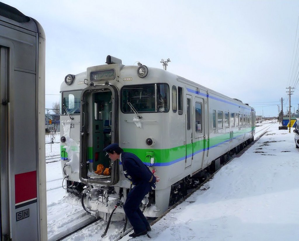 Lokalverkehr in Ost-Hokkaido: KIHA 54 507 hat den KIHA 40 721 von Abashiri nach Shiretoko Shari mitgebracht; jetzt werden die beiden Wagen entkuppelt und die Kupplung des KIHA 54 507 verpackt. 18.Februar 2009. SEMMÔ-LINIE Peter Ackermann