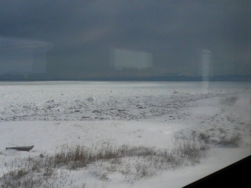 Die DE10 1660 mit dem Treibeis-Sonderzug: Blick aus einem der Aussichtswagen auf das Einsatzgebiet der mittelgrossen Diesellok DE10 1660; am folgenden Tag ist das Meer völlig zugefroren!18.Februar 2009. Peter Ackermann