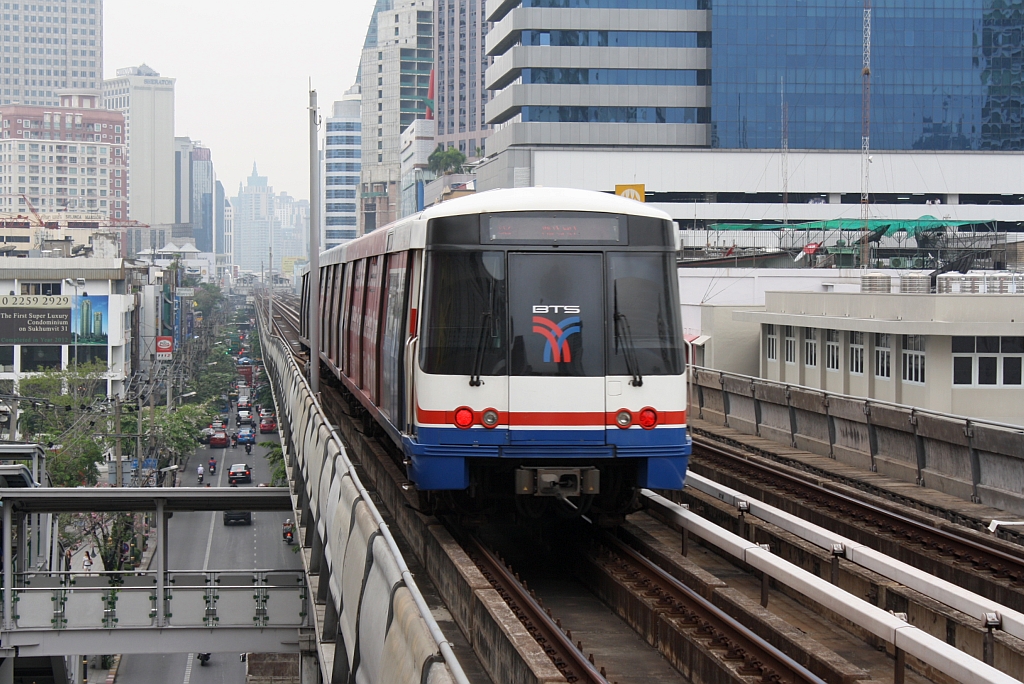 BTS (Skytrain) Triebwagen 11.. hat am 16.März 2011 die Phrom Phong Station (E5) verlassen und fährt in Richtung Asok Station (E4).