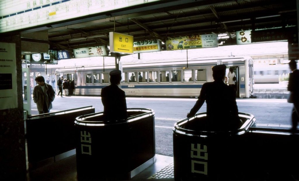KIHA 31: Blick durch die Bahnsteigsperre von Kumamoto Hauptbahnhof. Dahinter steigen die Fahrgäste in den KIHA 31 17 ein. 31.März 1997. HÔHI-HAUPTLINIE Peter Ackermann