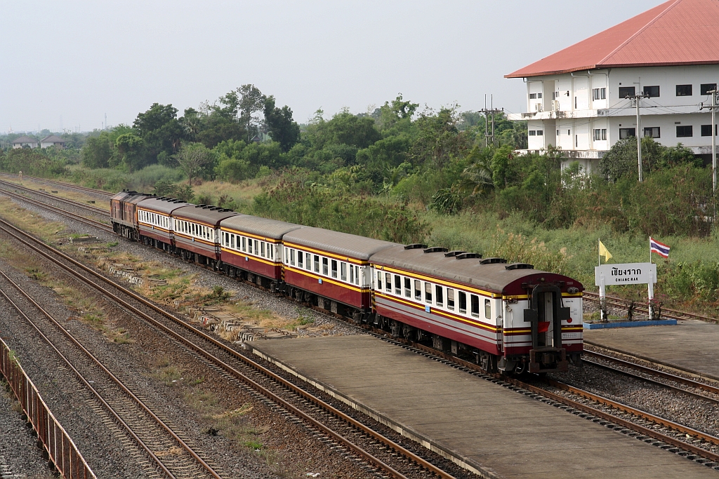 Sp.EXP 7 (Krung Thep Aphiwat - Chiang Mai) mit dem APD.60 2527 als letztes Fahrzeug fährt am 26.März 2024 durch die Chiang Rak Station. Karl Seltenhammer