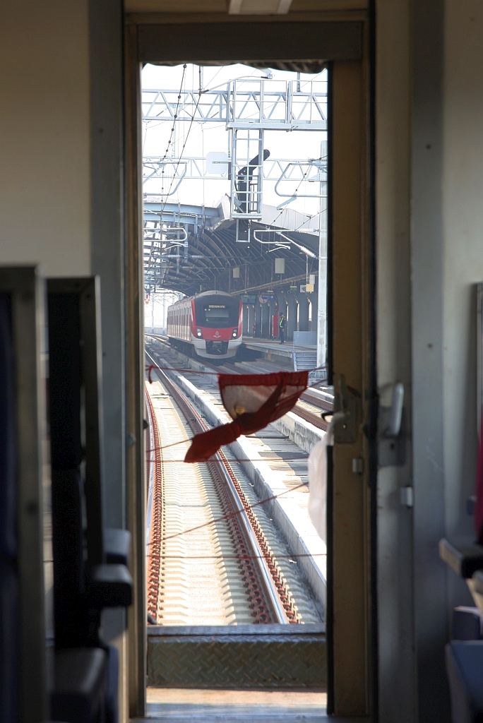 Blick durch die Stirnwandtüre des, als letzten Wagen des ORD 208 (Nakhon Sawan - Hua Lomphong) gereihten, บชส. 1184 (บชส. =BTC./Bogie Third Class Carriage) auf einen in der Lak Si Station der SRTET Red Lines (RN) haltenden Triebwagen der Type Hitachi AT100. - Bild vom 10.Dezember 2023. Karl Seltenhammer