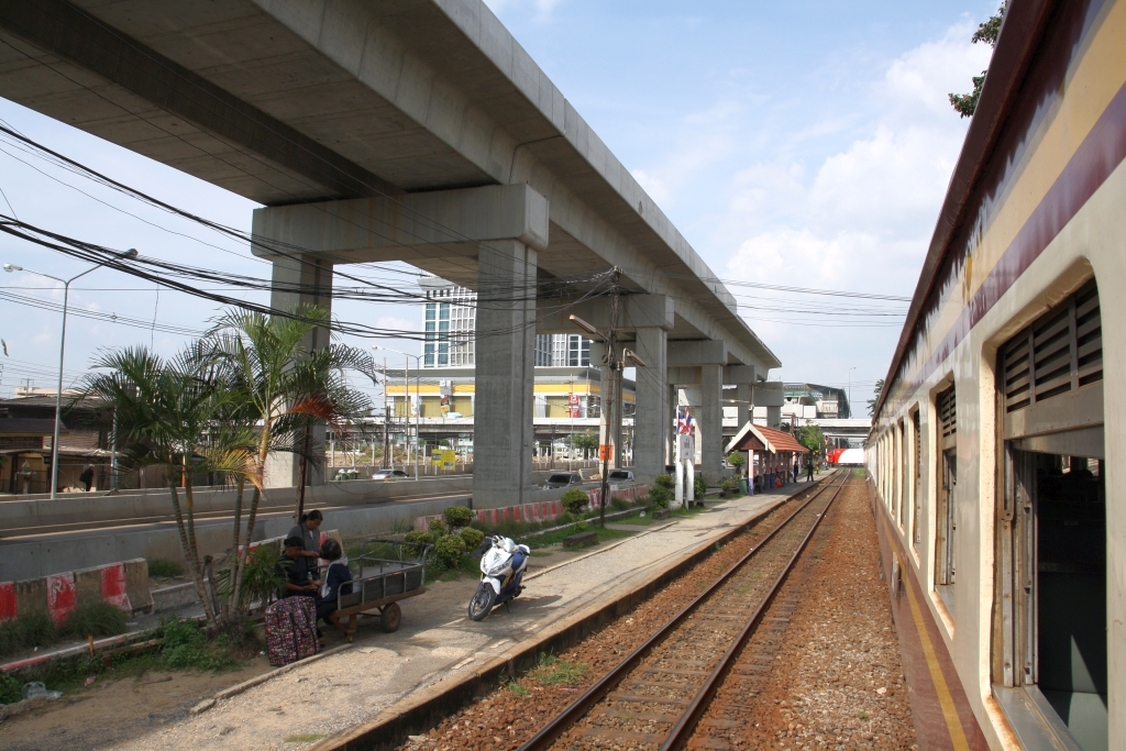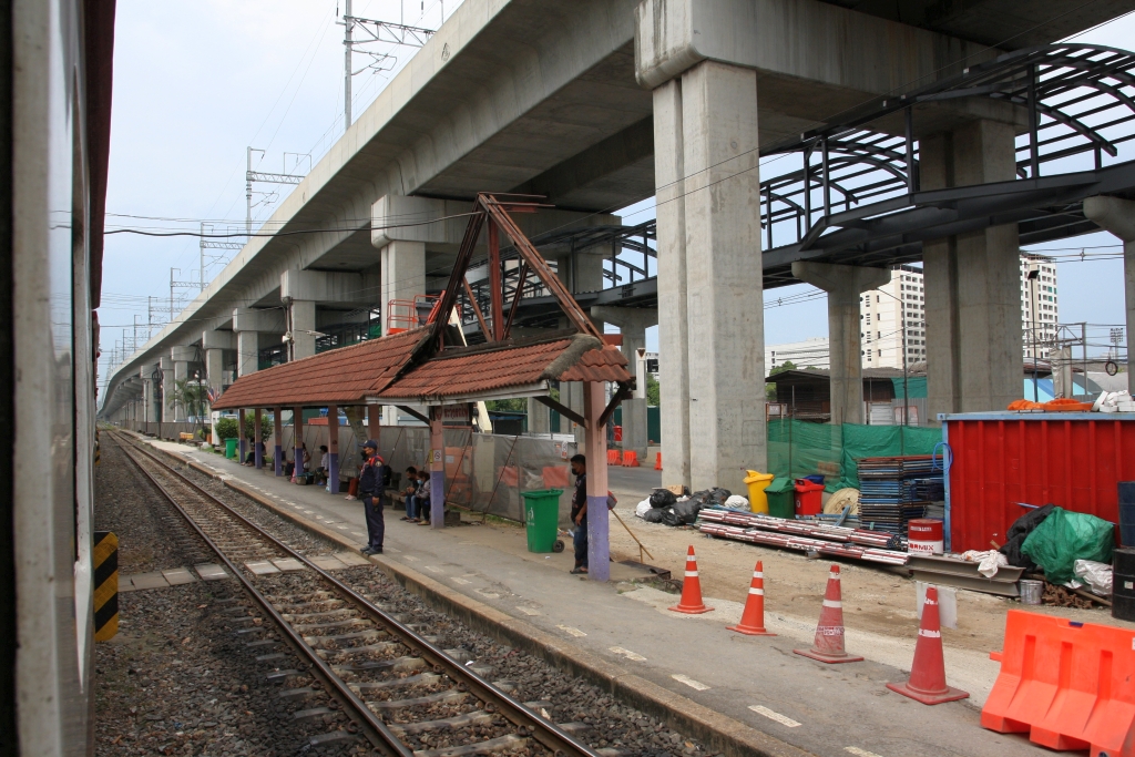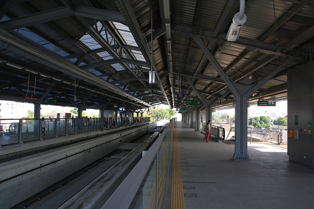 Durch den Bau der SRTET Red Lines wurden auch einige Straßen neu trassiert. Infolge dessen sind nun einige Bahnsteige und deren Dächer schmäler als vorher. SRT Lak Si Station am 01.Mai 2022. Karl Seltenhammer