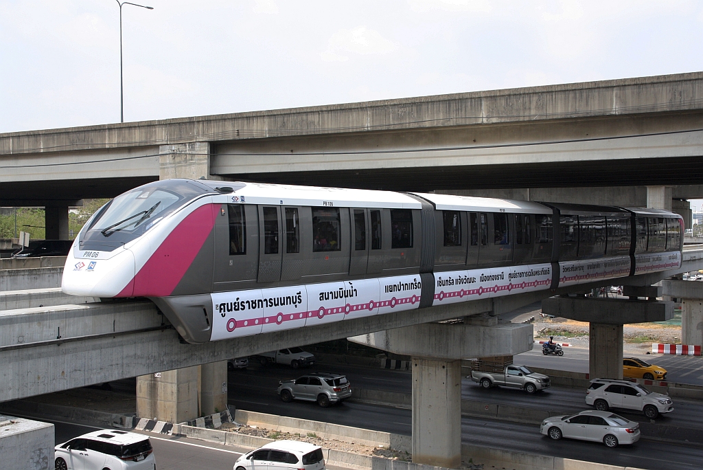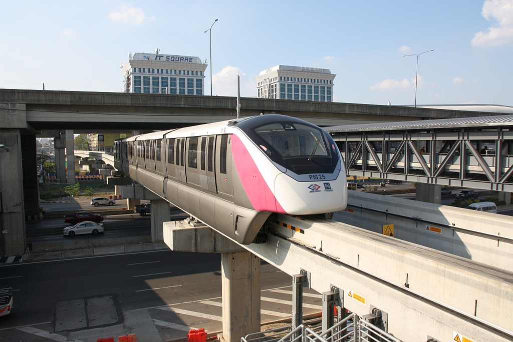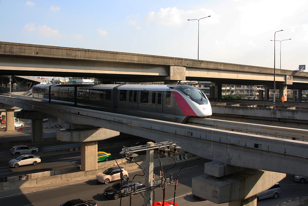 MRT PM27 (Hersteller: Bombardier Transportation + CRRC Nanjing Puzhen, Type Innovia Monorail 300) hat am 25.März 2024 die Lak Si Station (PK14) in Richtung National Telecom Station (PK13) verlassen. Karl Seltenhammer