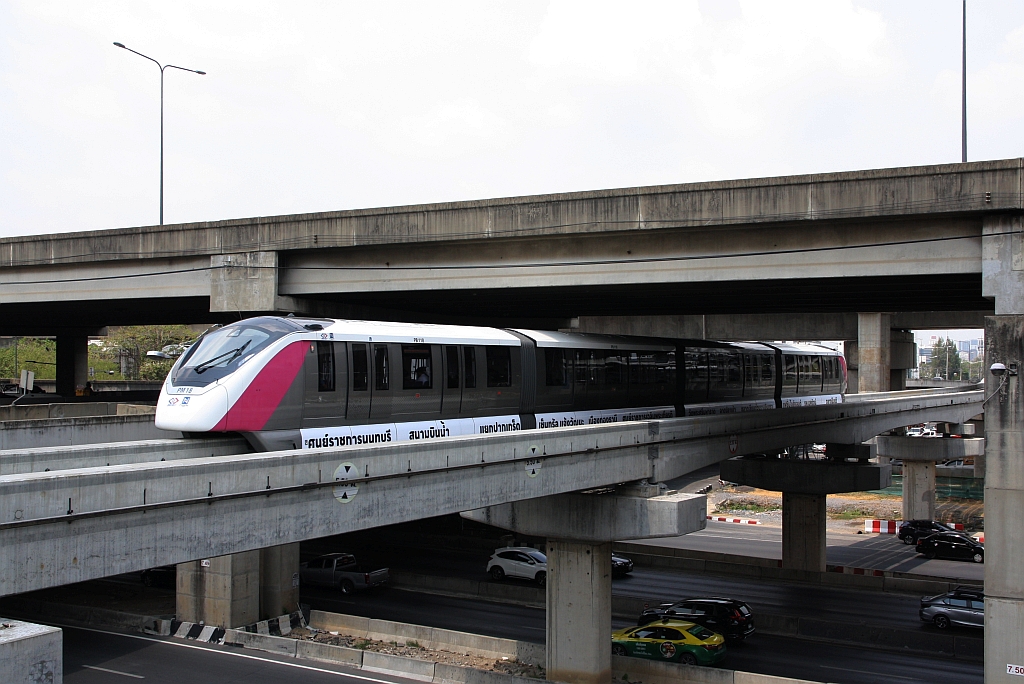 MRT PM18 (Hersteller: Bombardier Transportation + CRRC Nanjing Puzhen, Type Innovia Monorail 300) hat am 25.März 2024 die Lak Si Station (PK14) in Richtung National Telecom Station (PK13) verlassen. Karl Seltenhammer