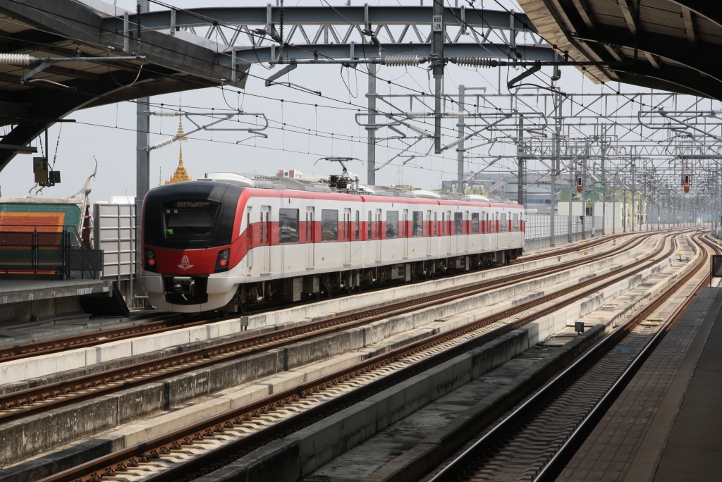 SRTET 10xx am 28.April 2023 kurz nach der SRTET Lak Si Station in Richtung Bang Sue Grand Station fahrend (aufgenommen durch die Stirnwandtüre des letzten Wagen des ORD 207).- Die beiden inneren Gleise werden seit der Inbetriebnahme der Krungthep Aphiwat Station der SRT (vorher Bang Sue Grand Station genannt) am 19.Jänner 2023 von den Zügen der Northern und Northeastern Line ohne Halt zwischen Krungthep Aphiwat Station bzw. Nikhom Rotfai Km. 11 Station und Don Muang Station befahren. Karl Seltenhammer
