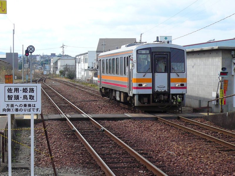 KIHA 120: Die KIHA 120 des westjapanischen Hochlandes (KIHA キハ=gewöhnliche Dieseltriebwagen). Gebaut:1991 mit Quersitzen(Nr.201-208),1992 mit Längssitzen(Nr.1-22),1993-95 Mischform Längs- und Quersitze (Nr.301-359).Im Besitz der JR-Westjapan. Die im Hochland eingesetzten Wagen haben einen gelben und einen roten Streifen. Hier ist KIHA 120-337 in Tsuyama, 28.Februar 2009. Peter Ackermann