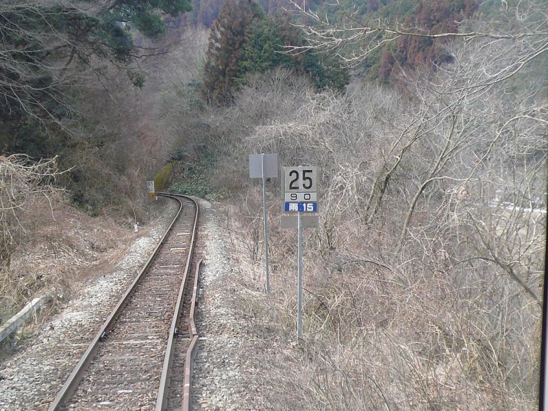 Die KIHA 120 des westjapanischen Hochlandes - Fahrt im KIHA 120-328:An vielen Stellen ist die Höchstgeschwindigkeit auf 15 km/h beschränkt. Hier zeigt die Tafel 25 km/h für die nächsten 90 Meter an, aber bei Regen (雨)nur 15 km/h! Zwischen Nagi und Mimasaka Kawai, 28.Februar 2009.