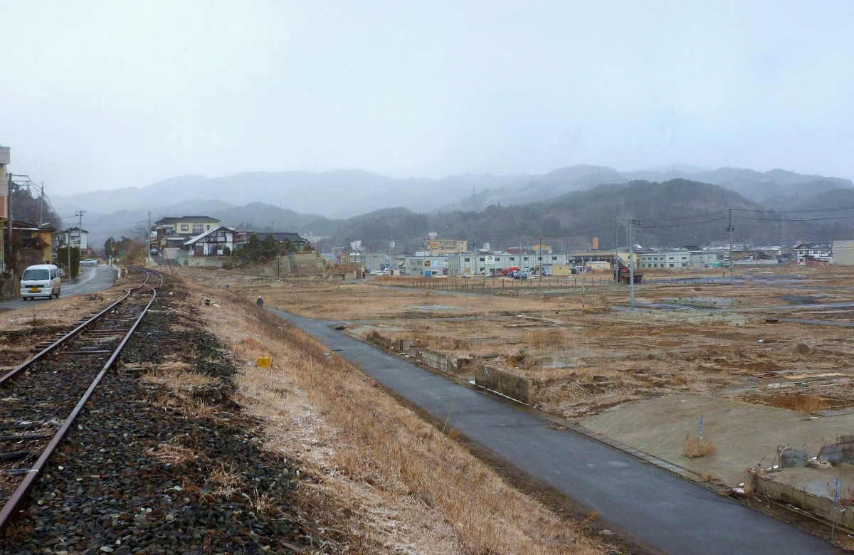 Ôfunato-Linie, Bahnhof Shishiori Karakuwa am 20.Februar 2013: Der Tsunami vom 11.März 2011 hat die ganze Ortschaft hinweggespült; nach dem Einsturz von Oeltanks am Hafen hatte sich der Tsunami als brennende Walze über Shishiori Karakuwa ergossen. Im Hintergrund rechts stehen ein paar Baracken für die Nothilfe. Im Spiegel wird sich der Triebwagen vom oberen Bild nie mehr spiegeln. Peter Ackermann
