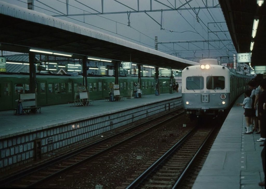 Keiô-Konzern, Inokashira-Linie, Serie 3000: Zug Nr.9 (mit Endwagen 3709) mit beige-farbiger Front am Abend in Tokyo-Eifukuchô. Links steht ein grüner Altbauzug am Bahnsteig. 3.Mai 1973. Peter Ackermann