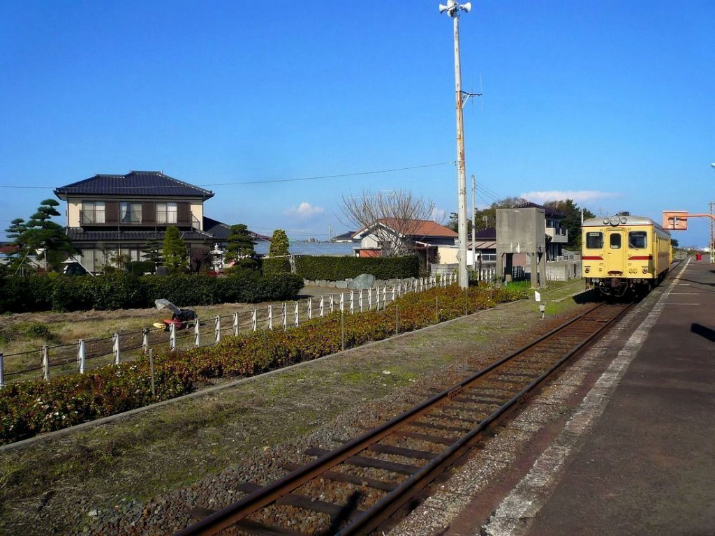 Grunddaten der Hitachinaka-Bahn: Die Hitachinaka-Bahn ist eine kleine Privatbahn von der Stadt Katsuta aus, nordöstlich von Tokyo; 1067mm-Spur, 14,3km lang, dank kommunaler Trägerschaften und starker lokaler Unterstützung 2008 der Stilllegung entgangen. Beim Erdbeben im März 2011 haben nun gewaltige tektonische Verschiebungen Teile der Strecke völlig zerstört. Im Bild steht der alte Triebwagen 2004 an der Endstation Ajigaura an der Pazifik-Küste, 26.November 2009. Peter Ackermann