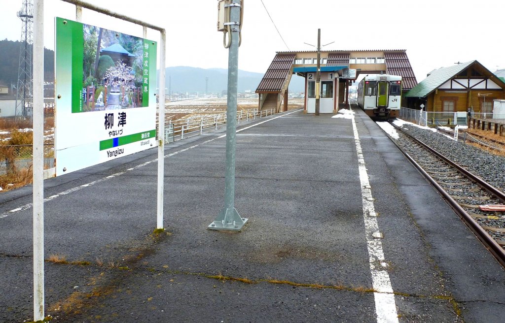 Kesennuma-Linie: Von der im Tsunami zerstörten Kesennuma-Linie sind nur noch 17,5 km befahrbar; die Strecke endet abrupt hier im Dorf Yanaizu. Eindrucksvoll sind die Stationstafeln der Kesennuma-Linie, die auf die kulturellen und natürlichen Sehenswürdigkeiten der jeweiligen Ortschaft hinweisen. Die Angabe der folgenden Station auf der Tafel ist abgedeckt, da es keine solche mehr gibt. Anstatt der bunten grünen Doppeltriebwagen KIHA 48 genügt ein einzelner Wagen, hier KIHA 110-125. 15.Februar 2013. Peter Ackermann