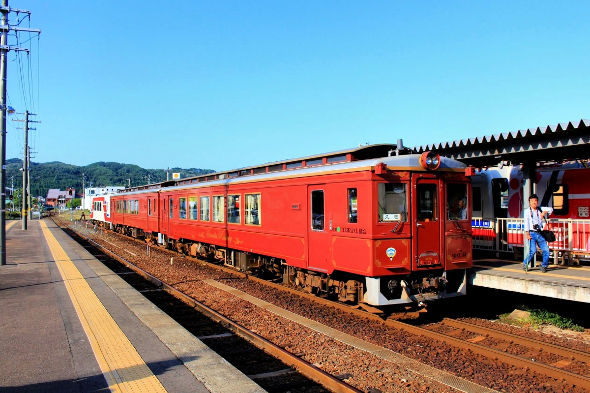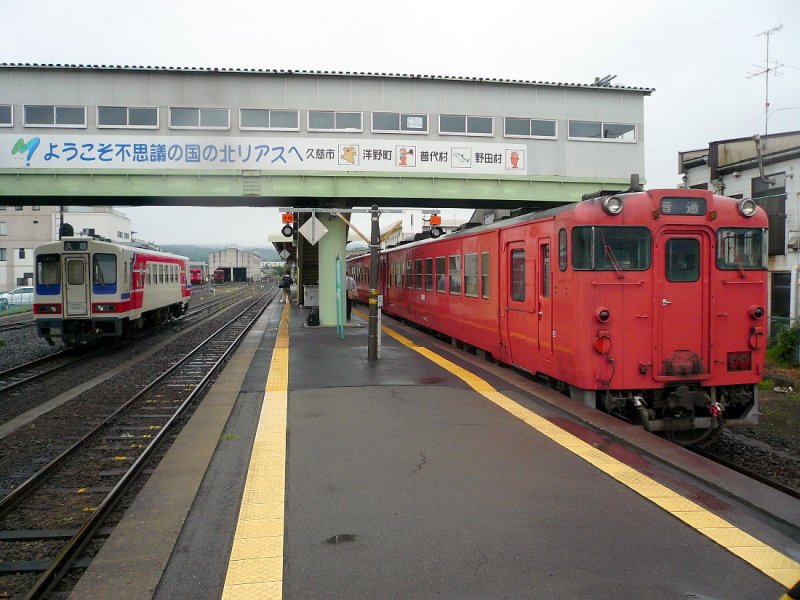 KIHA 40 (キハ40): Diese Serie hat beidseitig Führerstände und Türen am Wagenende, Baujahre 1976-82,noch 358 Wagen dieses Typs im Einsatz): Im Bild KIHA 40 551, einer der ganz wenigen, die noch den Originalanstrich (blass rot) für Regionalzug-Dieseltriebwagen der alten Staatsbahn tragen. Links ein Triebwagen der Sanriku-Bahn; die Anschrift auf der Passerelle heisst Gäste willkommen im "wundersamen Land des nördlichen Lias (=harter Sandstein)-Küstengebiets". Kuji, 24.August 2008.