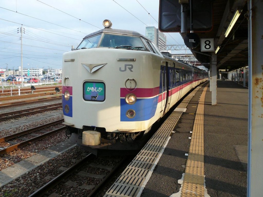 Serie 481 / 485: Ein zur Dreiwageneinheit reduzierter Zug für den leichten Städteverkehr im äussersten Nordwesten der japanischen Hauptinsel. Der Intercity "Kamoshika" (eine grosse Gemsenart, die in dieser Region häufig ist; an der Front des Zugs abgebildet!) wartet in Akita auf Abfahrt nach Aomori; er besteht aus einem motorisierten Wagenpaar (Frontwagen KUMOHA 485-1006) mit Steuerwagen. 10.Juli 2010. Peter Ackermann